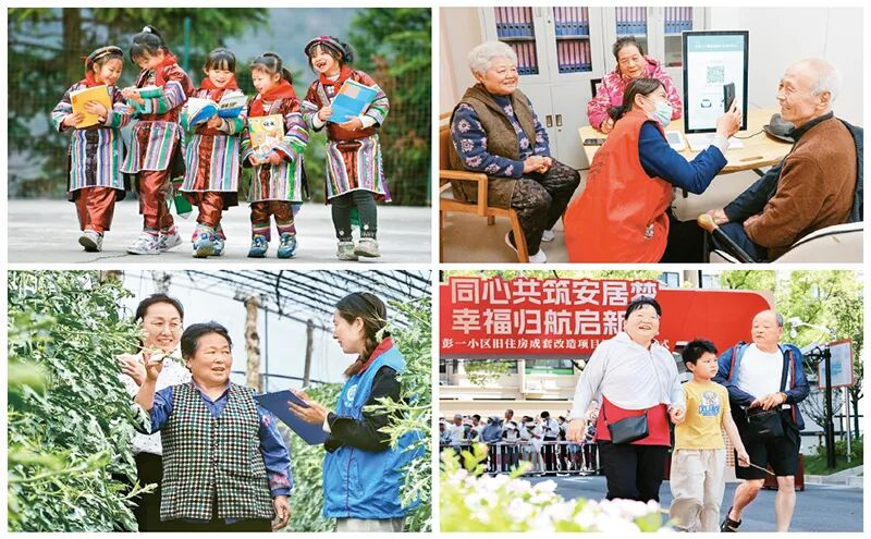 新时代以来,我国幼有所育、学有所教、劳有所得、病有所医、老有所养、住有所居、弱有所扶不断取得新进展,人民群众获得感、幸福感、安全感更加充实、更有保障、更可持续。左上图为领到新书的瑶族学生一起交流(新华社记者 杨文斌/摄),右上图为老人在护理中心测量健康数据(新华社记者 朱峥/摄),左下图为政务服务站工作人员为瓜农办理社保业务(新华社记者 李欣/摄),右下图为领取新房钥匙的一家三口走进改造后的小区(新华社记者 方喆/摄)。