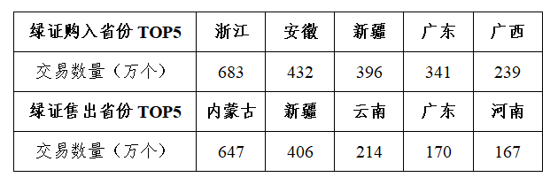 广州电力交易中心平台绿证交易购入省份排名前五的省份为浙江、安徽、新疆、广东、广西,绿证交易售出省份排名前五的省份为内蒙古、新疆、云南、广东和河南。