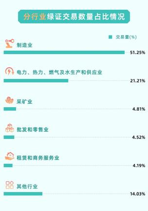广州电力交易中心平台绿证交易数量排名前五的行业为:制造业(51.25%)、电力、热力、燃气及水生产和供应业(21.21%)、采矿业(4.81%)、批发和零售业(4.52%)、租赁和商务服务业(4.19%)。