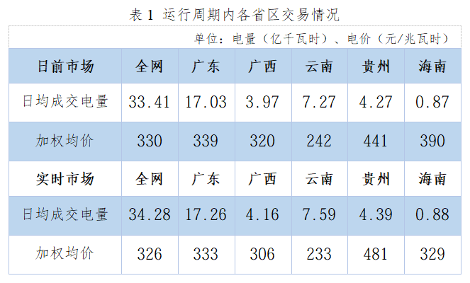 实时市场,广东、广西、云南、贵州、海南日均成交电量分别为17.26、4.16、7.59、4.39、0.88亿千瓦时,加权均价分别为333、306、233、481、329元/兆瓦时。
