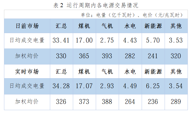 日前市场,煤机、气机、水电、新能源日均成交电量分别为17.00、2.75、4.43、5.70亿千瓦时,加权均价分别为365、393、282、241元/兆瓦时。实时市场,煤机、气机、水电、新能源日均成交电量分别为17.07、2.93、4.49、6.25亿千瓦时,加权均价分别为373、388、264、236元/兆瓦时。