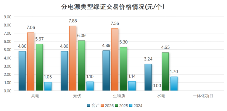 从不同电源类型绿证交易价格情况看,生物质项目成交价格最高,平均价格为4.89元/个;风电项目次之,平均价格为4.80元/个。