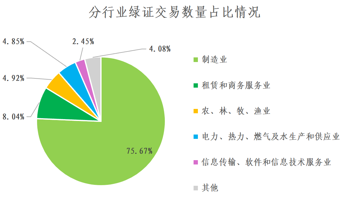 广州电力交易中心平台绿证交易数量排名前五的行业为:制造业(75.67%)、租赁和商务服务业(8.04%)、农、林、牧、渔业(4.92%)、电力、热力、燃气及水生产和供应业(4.85%)、信息传输、软件和信息技术服务业(2.45%)。