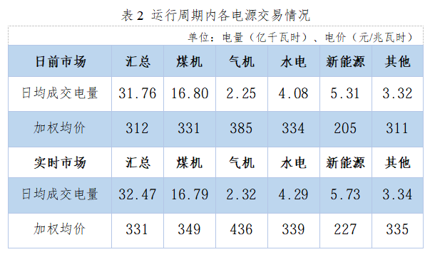 实时市场,煤机、气机、水电、新能源日均成交电量分别为16.79、2.32、4.29、5.73亿千瓦时,加权均价分别为349、436、339、227元/兆瓦时。