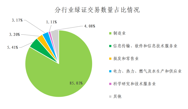 广州电力交易中心平台绿证交易数量排名前五的行业为:制造业(85.03%)、信息传输、软件和信息技术服务业(5.41%)、批发和零售业(3.2%)、电力、热力、燃气及水生产和供应业(3.17%)、科学研究和技术服务业(1.11%)。