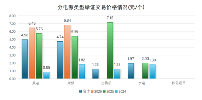 从不同电源类型绿证交易价格情况看,风电项目成交价格最高,平均价格为4.98元/个;光伏项目次之,平均价格为4.74元/个。
