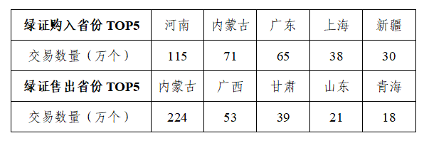 广州电力交易中心平台绿证交易购入省份排名前五为河南、内蒙古、广东、上海和新疆,绿证交易售出省份排名前五为内蒙古、广西、甘肃、山东和青海。