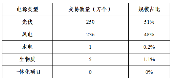 从不同电源类型绿证交易规模情况看,广州电力交易中心平台光伏项目交易数量最多,交易规模为250万个,占交易总量51%,环比增长21%。风电项目次之,交易规模为236万个,占交易总量的48%,环比下降37%;