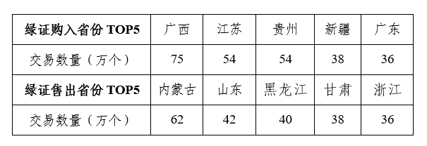 广州电力交易中心平台绿证交易购入省份排名前五为广西、江苏、贵州、新疆、广东,绿证交易售出省份排名前五为内蒙古、山东、黑龙江、甘肃、浙江。