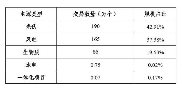 从不同电源类型绿证交易规模情况看,广州电力交易中心平台光伏项目交易数量最多,交易规模为190万个,占交易总量43%,环比下降38%。风电项目次之,交易规模为165万个,占交易总量的37%,环比下降38%;