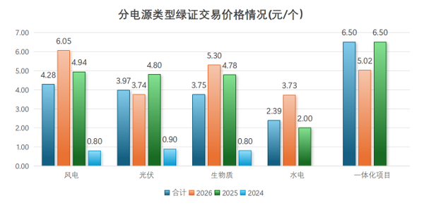 从不同电源类型绿证交易价格情况看,一体化项目项目成交价格最高,平均价格为6.5元/个;风电项目次之,平均价格为4.28元/个。