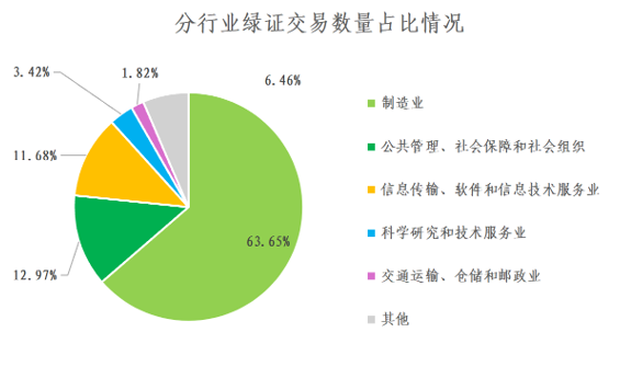 广州电力交易中心平台绿证交易数量排名前五的行业为:制造业(63.65%)、公共管理、社会保障和社会组织(12.97%)、信息传输、软件和信息技术服务业(11.68%)、科学研究和技术服务业(3.42%)、交通运输、仓储和邮政业(1.82%)。